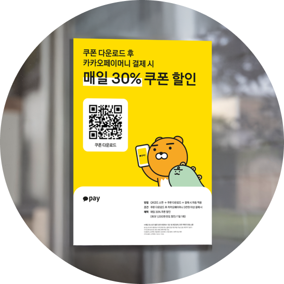 이벤트 포스터 QR을 고객이 인식하면, 카카오페이가 결제 고객에게 쿠폰을 드려요